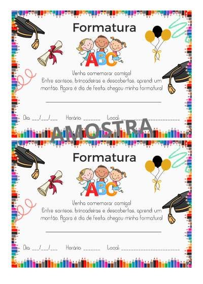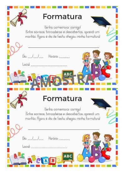 ✨ Este pacote traz 10 convites de formatura do ABC totalmente editáveis, criados com muito carinho para deixar a cerimônia ainda mais especial. São modelos lindos, infantis, delicados e fáceis de personalizar com nome da criança, data, horário, local e turminha.