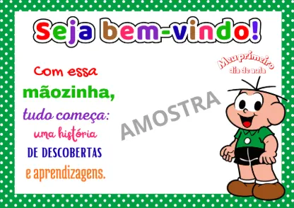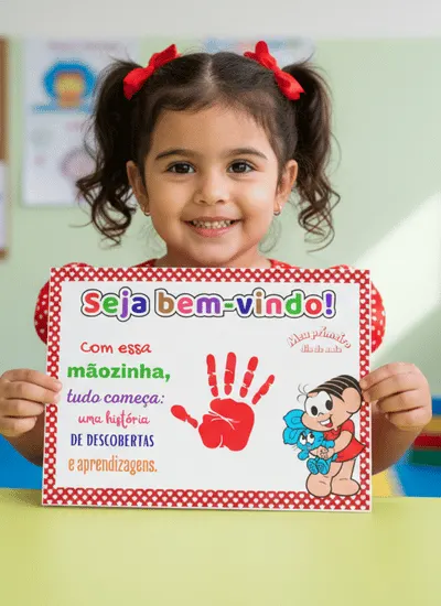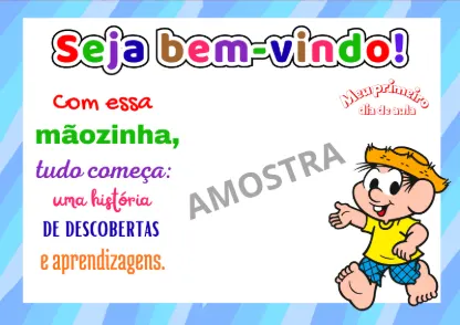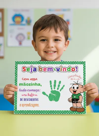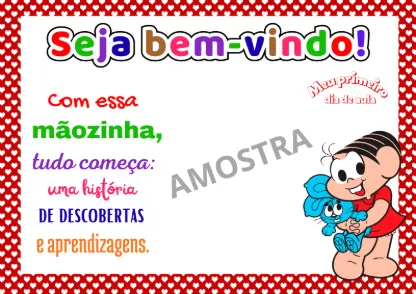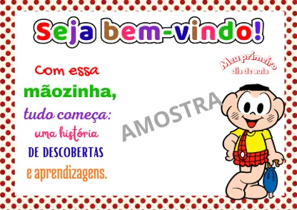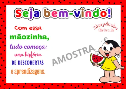 Esta atividade é uma folha de boas-vindas para o primeiro dia de aula, focada na recepção afetiva e no registro do crescimento da criança. Ela utiliza personagens da “Turma da Mônica” para criar conexão imediata com os pequenos.