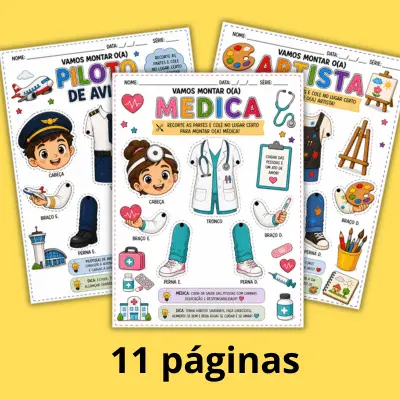 Com atividades de recorte e colagem, o aprendizado se torna leve, divertido e cheio de significado — desenvolvendo habilidades importantes enquanto exploram o mundo das profissões.