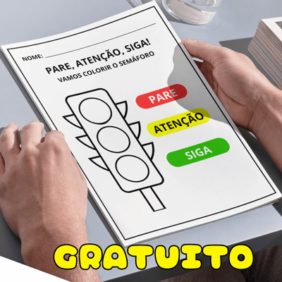 As crianças vão colorir o semáforo: vermelho para PARE, amarelo para ATENÇÃO e verde para SIGA.