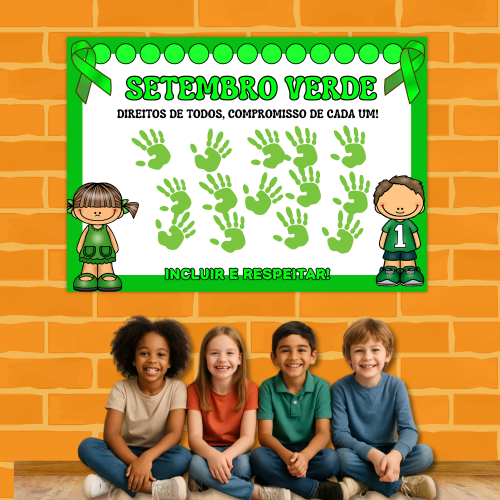O cartaz traz o título “SETEMBRO VERDE – Direitos de todos, compromisso de cada um!” e o subtítulo “Incluir e respeitar!”, acompanhados de ilustrações de crianças, fitas verdes e várias marcas de mãozinhas.