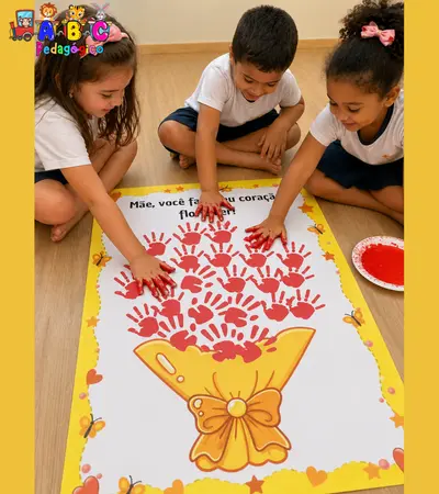 🖐️ A atividade é composta por várias mãozinhas com tinta vermelha formando um lindo buquê de flores, simbolizando o amor das crianças.
