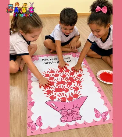 🖐️ As crianças utilizam tinta vermelha para carimbar suas mãozinhas, formando um buquê cheio de significado e carinho.