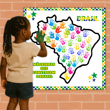 As crianças vão sujar as mãozinhas de tinta e, de forma divertida, preencher o mapa do Brasil com suas marcas coloridas, deixando registrado o rastro da união e da diversidade que constroem o nosso país. 🇧🇷✨