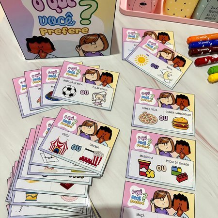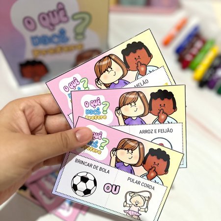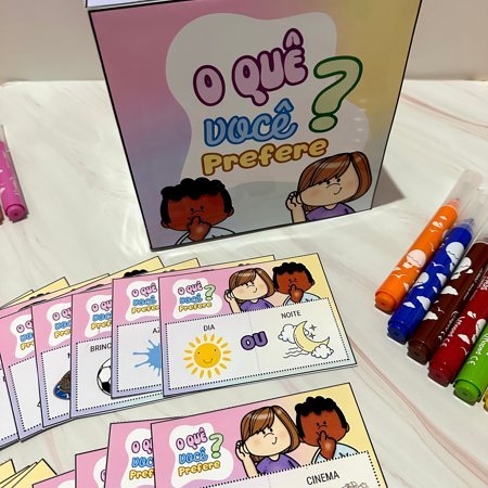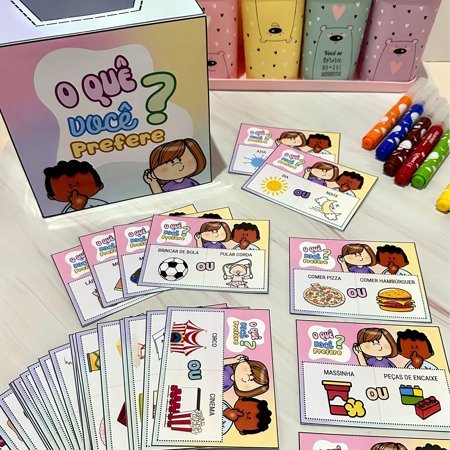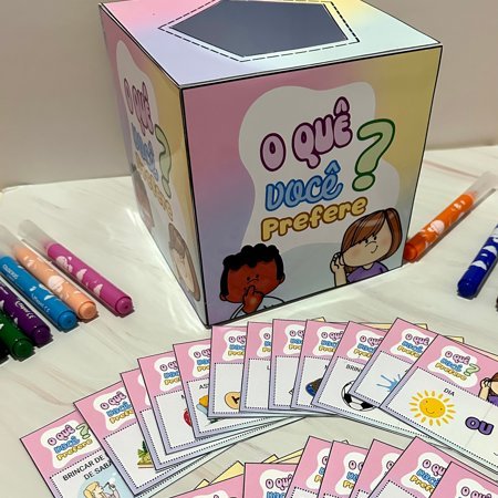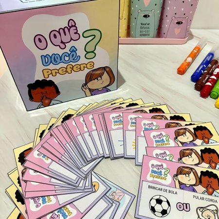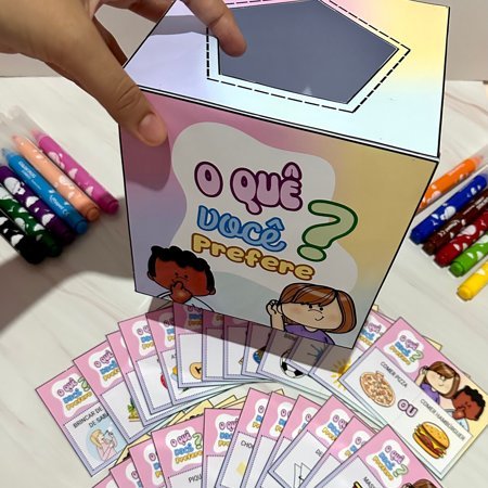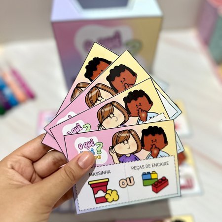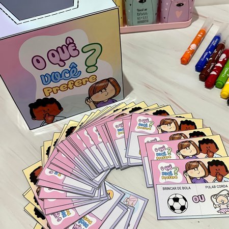 📦 36 fichas ilustradas com perguntas e uma caixinha temática para guardar e sortear as opções.