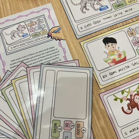 Este arquivo inclui 12 fichas com palavras formadas por sílabas simples, embaralhadas 🔡, que a criança deverá organizar na ordem correta para formar frases completas ✨.