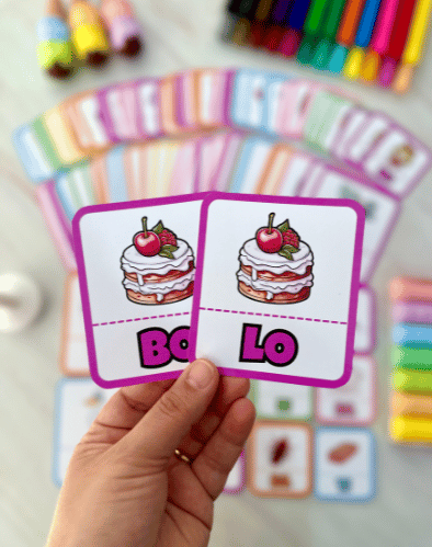 📄 O material está em PDF, pronto para impressão, e inclui várias fichas com sílabas que podem ser combinadas para formar palavras.