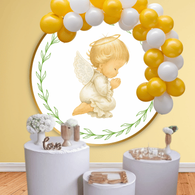 ⭐ Painel de batizado para imprimir com 133 cm de diâmetro, ideal para quem precisa de uma decoração delicada, rápida e acessível. Traz um design suave, perfeito para compor mesas, murais, ensaios fotográficos e celebrações íntimas.