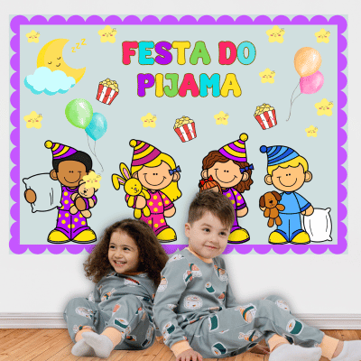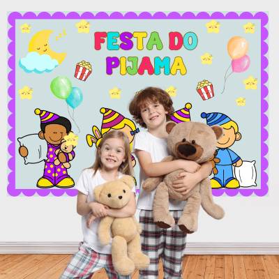 O painel traz crianças em pijamas fofinhos, segurando seus bichinhos de pelúcia, além de elementos lúdicos como balões, estrelas, lua, pipocas e o título “Festa do Pijama” em letras grandes e coloridas.