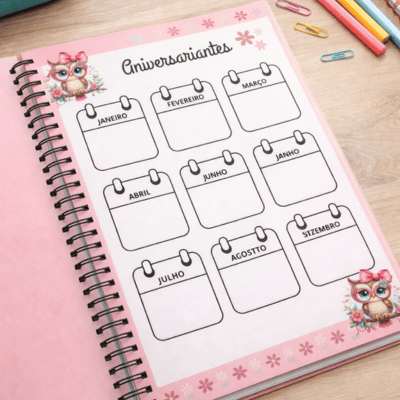 O planner também inclui páginas essenciais para a rotina escolar, como: