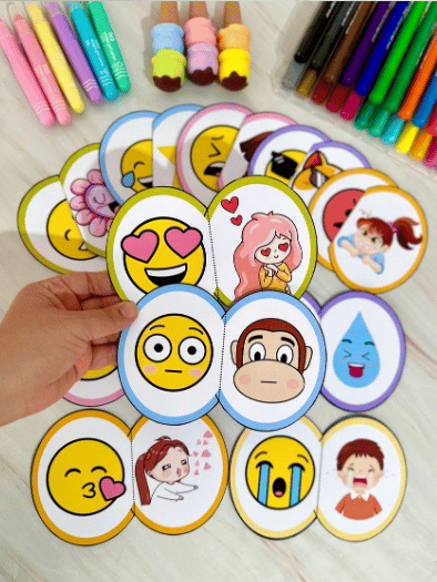 📄 O material vai em PDF pronto para impressão, com 20 fichas contendo peças de quebra-cabeça que representam diferentes sentimentos.